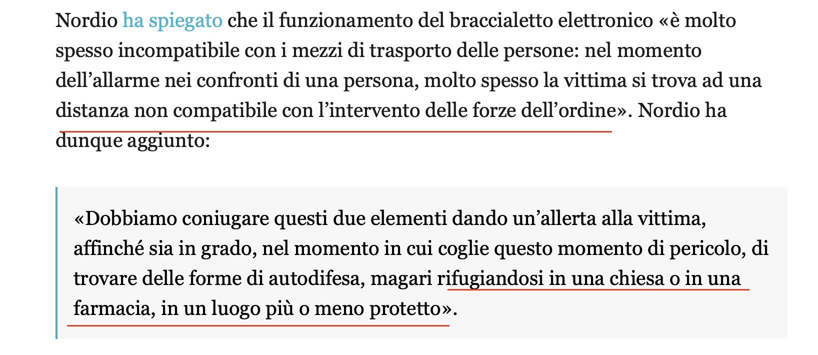 "content": "Da anni è noto che il braccialetto elettronico non tiene al sicuro le donne: quando l'uomo si avvicina a meno di 500 metri e scatta l'allerta, non c'è esponente delle forze dell'ordine che possa arrivare prima dell'uomo. E sempre che il braccialetto funzioni.\n\nCosa fare?\n\nLe donne si rifugino in chiesa o in farmacia oppure in un altro luogo più o meno sicuro\n(e se non c'è - aggiungo io - si arrangino).\n\nNordio è sempre una \"garanzia\". Non per le donne, di certo.\n\nhttps://www.ilpost.it/2025/05/15/nordio-braccialetti-elettronici-antistalking-chiesa-farmacia/?utm_medium=social\u0026utm_source=twitter\u0026utm_campaign=lancio\n\nhttps://cdn.masto.host/mastodonuno/media_attachments/files/114/513/841/974/378/295/original/7565e89846311df1.jpeg",