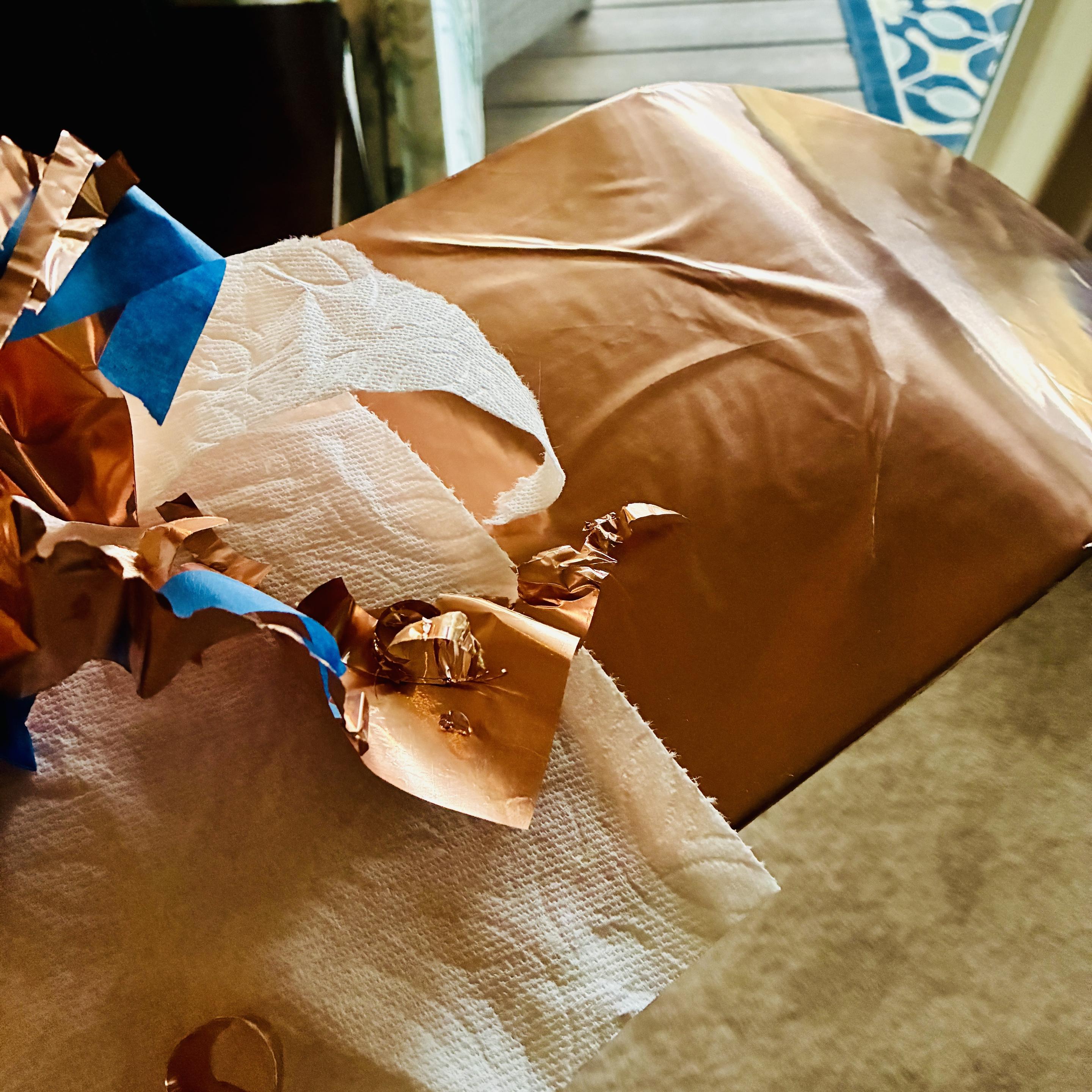 This copper sheet on skate deck art test was more difficult than I’d thought. Copper too thick, adhesive not strong enough.