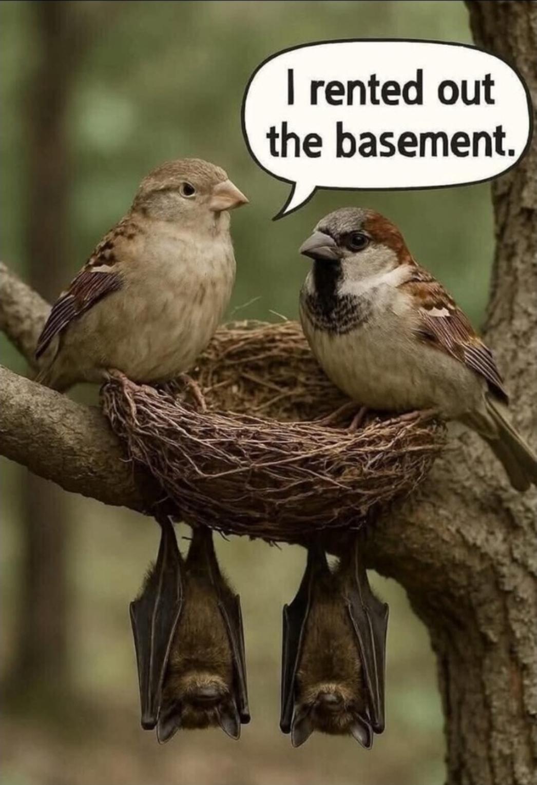 "content": "► https://FunHouseRadio.com \u003c- TUNE IN\n#meme #memes #birds #bats #lol\nhttps://s3.eu-central-2.wasabisys.com/mastodonworld/media_attachments/files/115/823/188/006/315/878/original/c54964de85bcc257.jpeg\n",