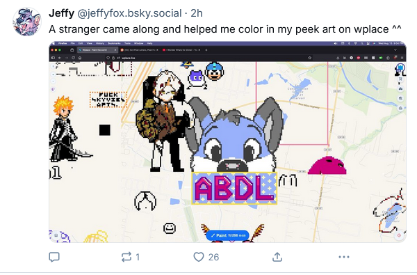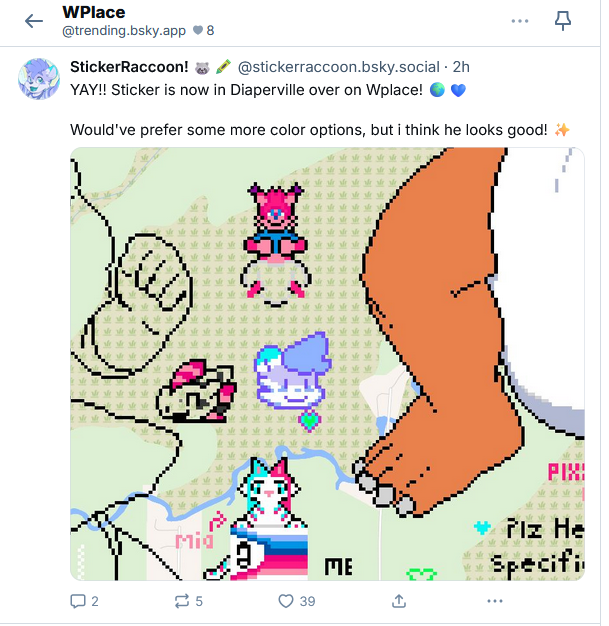 "content": "wplace going well\n\nhttps://s3.clubcyberia.co/pleroma/ef/38/36/ef3836747c7775987eade3359e6d18a49f37651893603896a7ad7b713f716830.png\nhttps://s3.clubcyberia.co/pleroma/59/9c/4d/599c4d748a6c268a1c7af955a2082f1bdd8ebd62fdc00a236ad889675cf08ea2.png",
