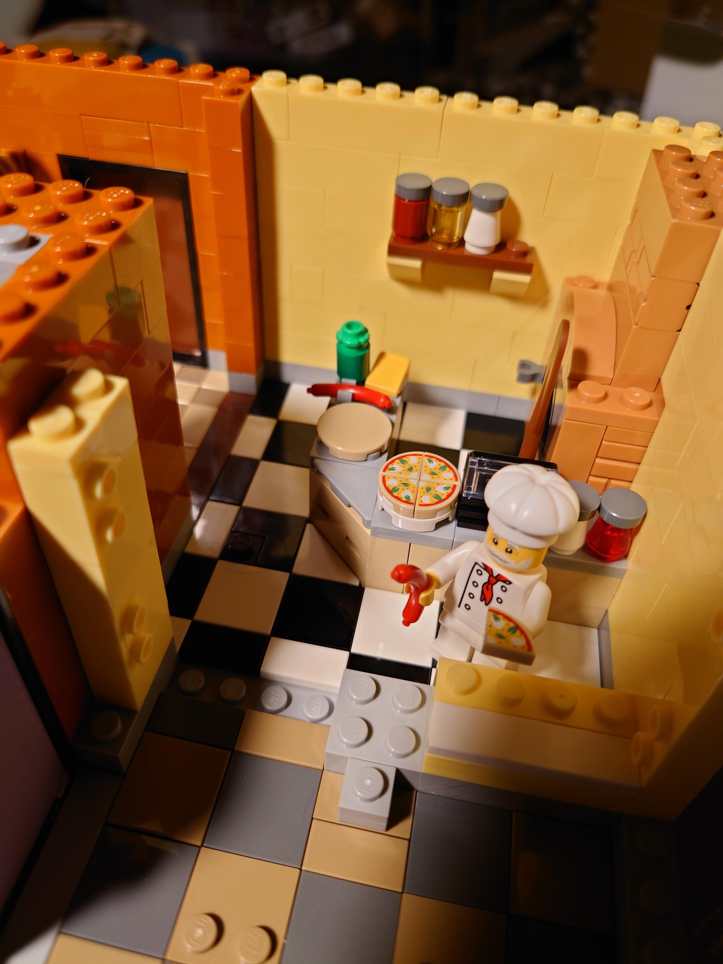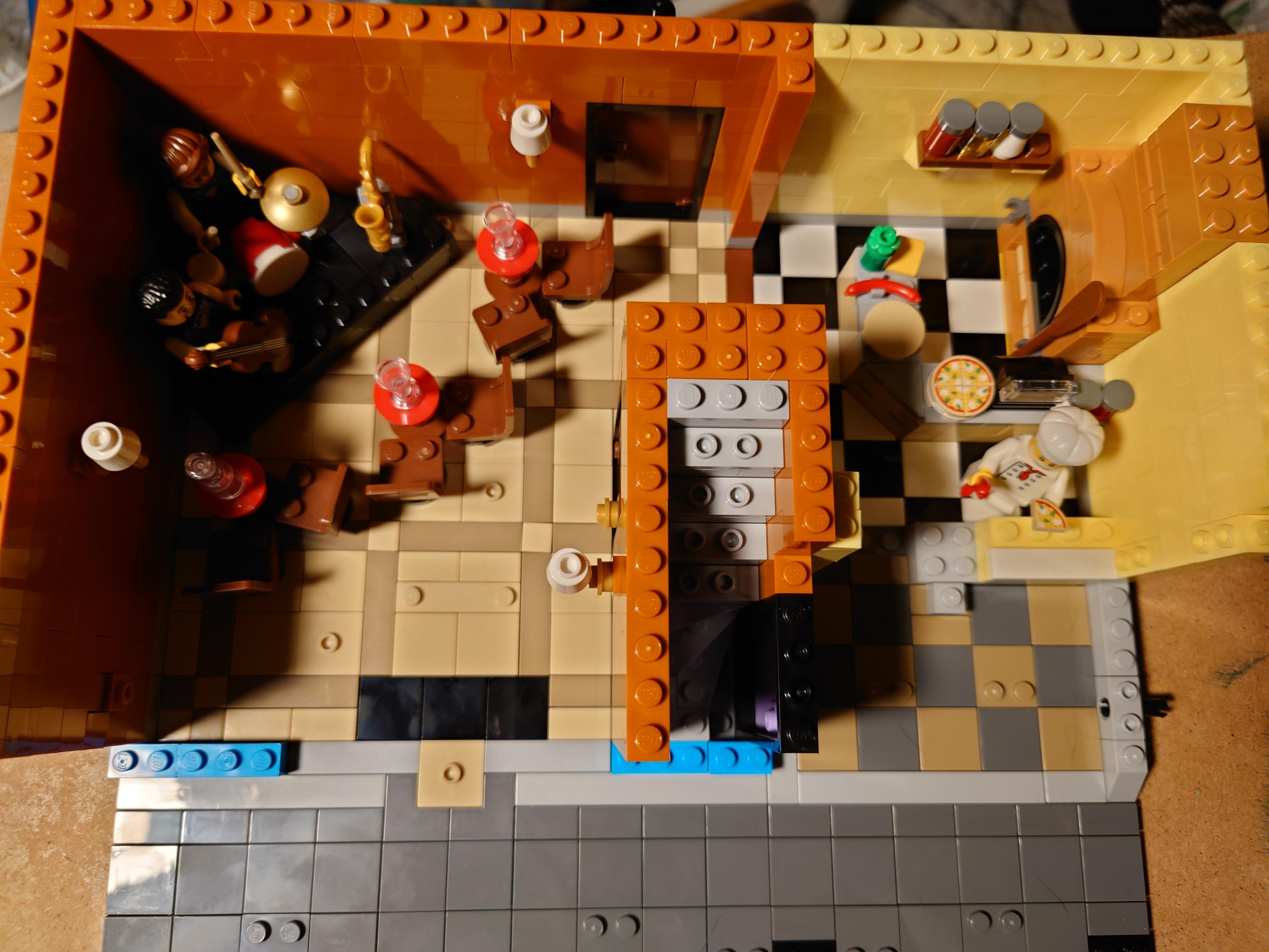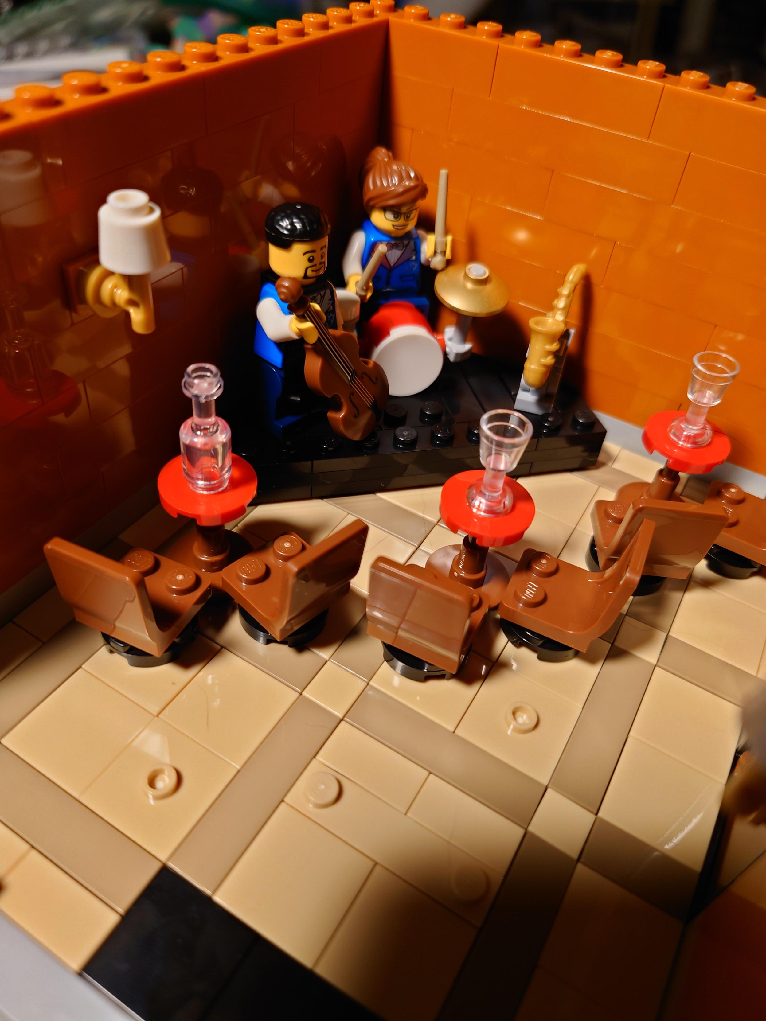 Bags 3: walls came up, stairs going up (over the loo), pizza baker moved in with all his stuff, and another musician. Tables and chairs in front of the stage. I made my first modification and raised the chairs a bit since the tables are so tall.