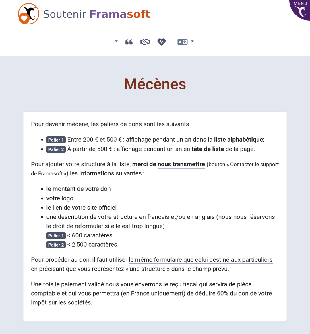 "content": "Et si votre entreprise aidait à construire un numérique plus juste ? \n\nEn devenant mécène de Framasoft, vous participez :\n- au développement de l'écosystème des logiciels libres,\n- au soutien des associations et collectifs,\n- à la création de communs numériques accessibles à toutes et tous.\n\n🤝 Rejoignez les entreprises qui font le choix du libre : https://soutenir.framasoft.org/fr/sponsors/\nhttps://stockage.framapiaf.org/framapiaf/media_attachments/files/115/220/585/545/613/563/original/fd6a138067791b3e.png\nhttps://stockage.framapiaf.org/framapiaf/media_attachments/files/115/220/585/641/670/625/original/3d25ab50a5c47f78.png\n",