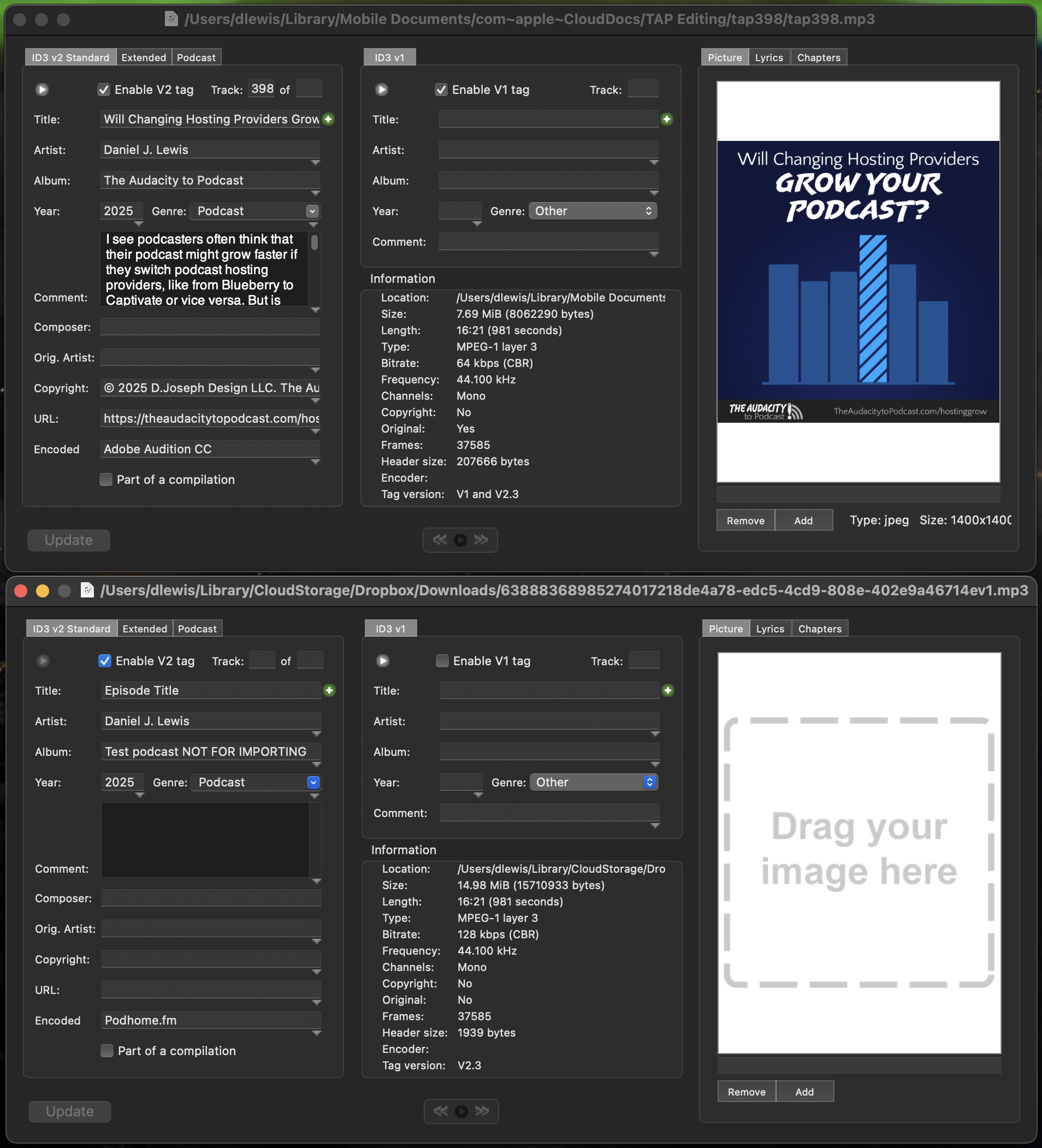 2. Screenshot shows original tags on top, Podhome's version on bottom. (It also stripped the "Lyrics" tag. Yes, I understand that it _replaced_ my title and album according to CMS data, and that's fine.)