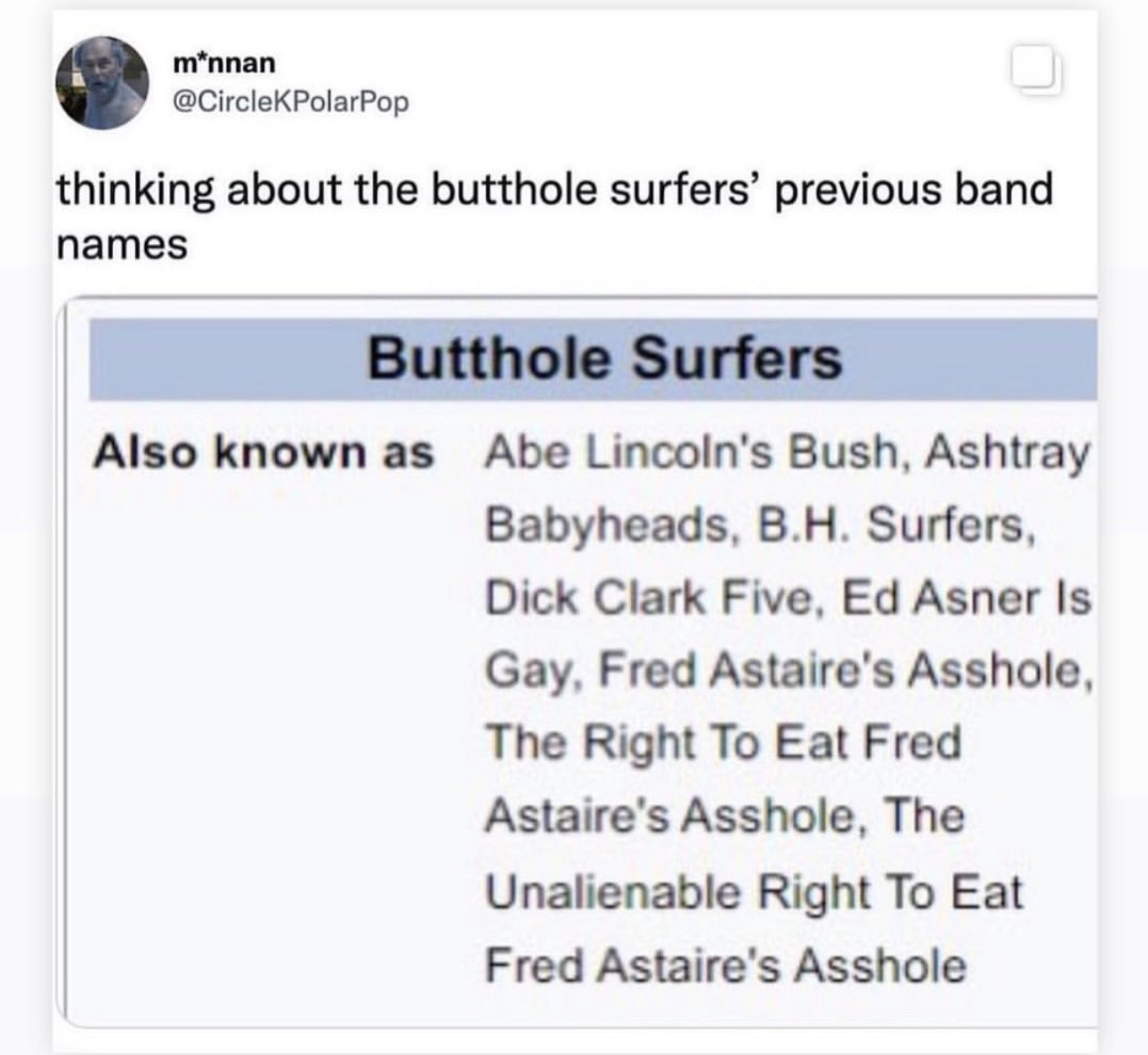 ☢️ :jhg_s: :jhg_n: :jhg_e: :jhg_e: :jhg_d: :denton_laugh: on Nostr: "Butthole Surfers" was the mild name that band came up with. "Butthole Surfers" was the mild name that band came up with.
