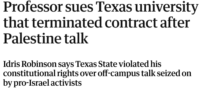 "content": "\"Philosophy professor Idris Robinson has sued Texas State University officials, asserting that the school violated his constitutional rights by ending his contract after he gave a talk on the Israeli-Palestinian conflict off-campus in another state where a fight broke out, the Guardian has learned.\n\nRobinson’s complaint names the school’s president, Kelly Damphousse, three top college officials, and the school’s board of regents. It concerns one of the more drawn-out and unusual cases of a university punishing faculty for expressing views on Israel and Palestine, following a social media campaign against Robinson.\n\nA tenure-track professor with four years of stellar performance reviews, according to the complaint, Robinson has been told he will no longer have a job in May, for a talk he gave two years earlier at a North Carolina anarchist book fair, in no way affiliated with the university.\n\nRobinson, the only Black philosophy professor at Texas State, said he filed the complaint because he “wants them to fulfill their side of the contract” – referring to his performance reviews and tenure track – and “to fight back against the prohibition of any discourse on Palestine that isn’t part of the mainstream political class.\"\n\nhttps://www.theguardian.com/us-news/2026/mar/25/professor-texas-state-university-israel-palestine\nhttps://kolektiva.social/system/media_attachments/files/116/290/973/185/180/082/original/f1732c34c2ff8c46.png\n",