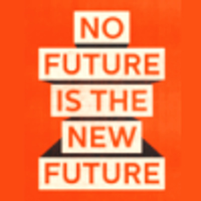 icon alt text: red all caps lettering on white banners on a red background: no future is the new future.